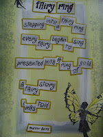Next I Googled Fairy Poems and found this sweet little poem. The image shows a lady steeping into a fairy ring and all of the fairies dancing and presumably (can't hear them lol!!!) singing. I copied the poem into MS Word, changed the font and made it larger. I then printed it out, coloured them with the same charcoal grey Inktense pencil as the background and activated it with gesso again. I then cu the words up and stuck them to the page and went over the font with a black extra fine Sharpie pen.